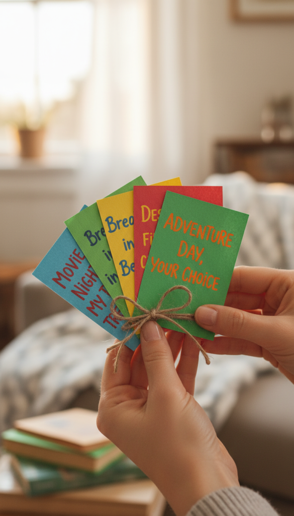 Design the coupons yourself – you can use cardstock, markers, and a little creativity. Punch a hole in each and tie them together with a ribbon. The beauty of this gift is the anticipation and the quality time it guarantees.