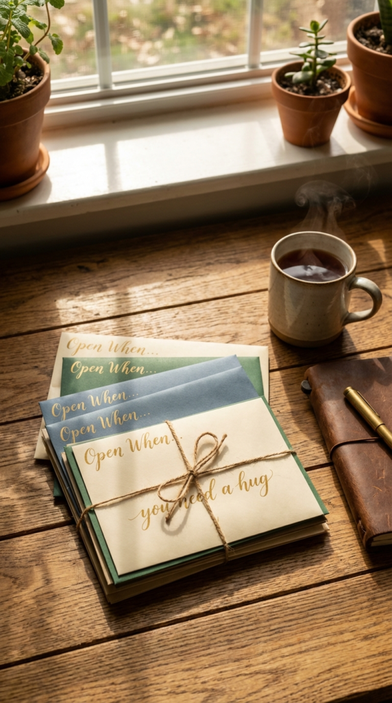 This idea is incredibly personal and shows immense foresight and care. Write a series of letters for different occasions or moods she might experience. For example, “Open When you’re feeling down,” “Open When you miss me,” “Open When you need a laugh,” or “Open When you’re celebrating something.”