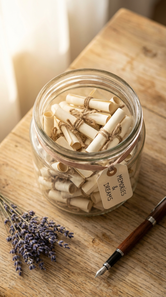 This is one of my absolute favorite ideas because it’s so simple yet incredibly powerful. A memory jar is exactly what it sounds like: a beautiful jar filled with handwritten notes of your favorite memories together.