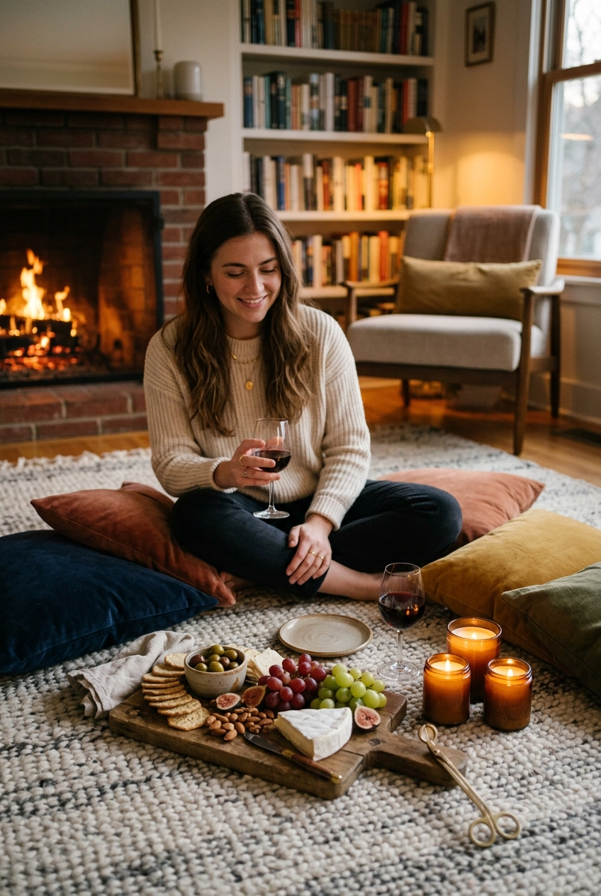 Clear a space on the floor. Use every blanket and pillow you own to create a soft base. Instead of a heavy meal, go for a “charcuterie and conversation” vibe. The key here is the environment. Use a Bluetooth speaker to play sounds of nature or soft jazz. The novelty of sitting on the floor and eating with your hands breaks the routine of a standard table dinner and encourages a more playful, relaxed interaction.
